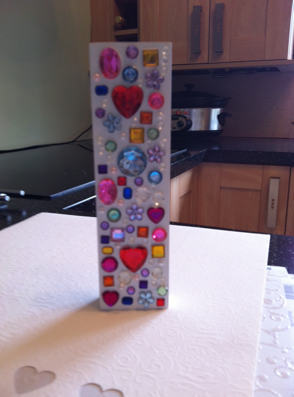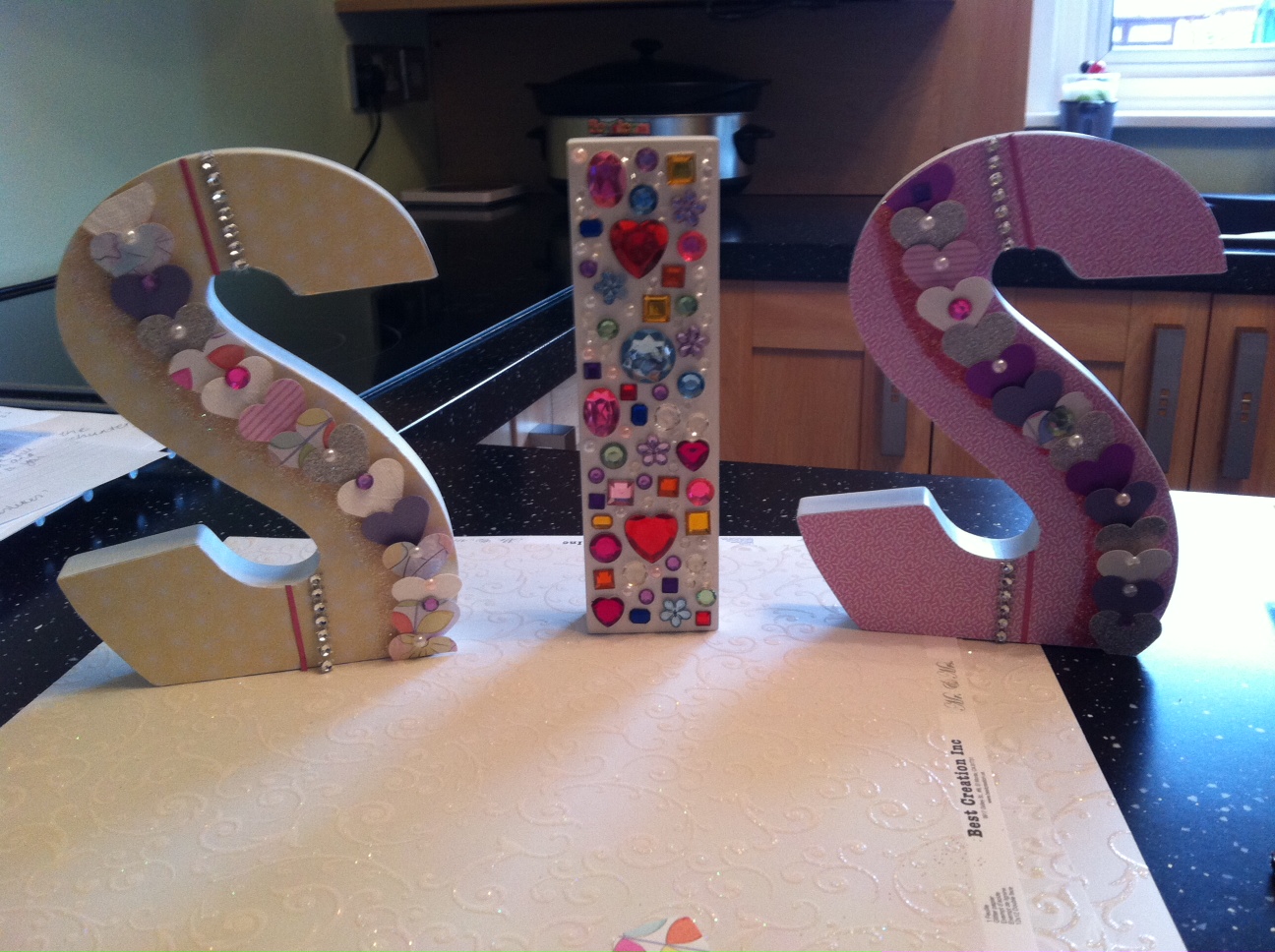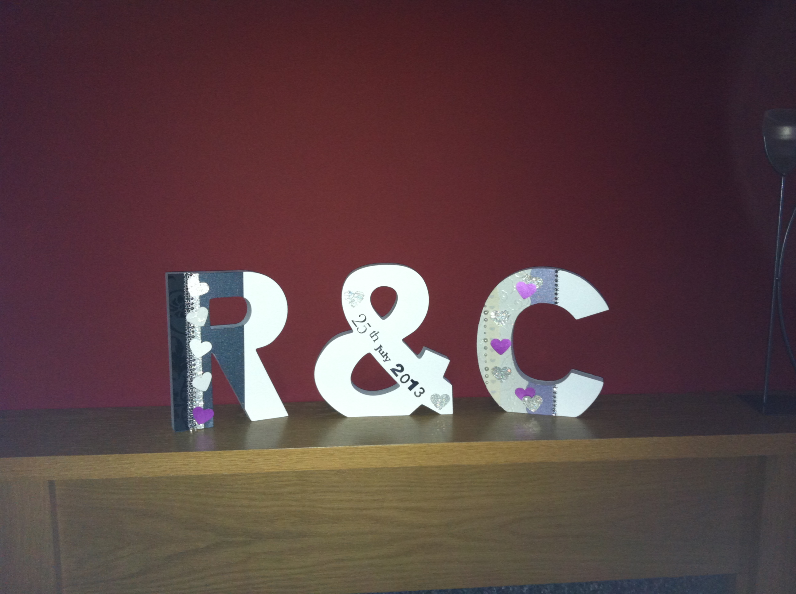Initially, upon first inspection of the garden centre I could only see the usual photo frames and glasses which I thought they might get a lot of as these are typical engagement gifts. Then, after a closer look, (I was getting a little desperate and frustrated by this point!!) I saw a range of white wood letters of the alphabet which looked quite plain as they sat on the shelf but they definitely held potential. Luckily, I had a stash of arts and crafts at home which I knew would come in very handy and I managed to jazz them up! Here’s what I started with and the finished result….